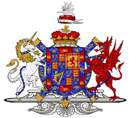 Dexter: an Unicorn Argent attired Or collared and chained Azure the collar charged with three Fleurs-de-lis Or; Sinister: a Dragon Gules collared Azure and chained Or the collar charged with three Fleurs-de-lis Or