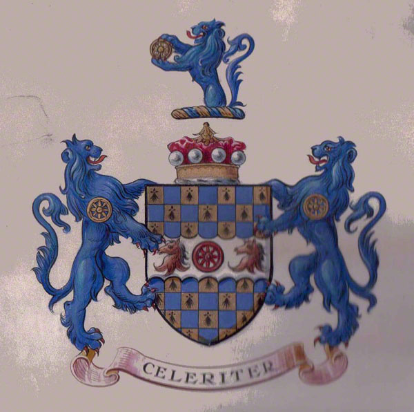 On either side a Lion Azure charged on the shoulder with a Wheel Or
