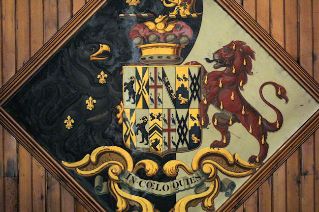 arms of his second wife (Quarterly, 1st and 4th, Per chevron embattled Or and Azure three Martlets counterchanged, for HUDSON; 2nd and 3rd, Argent, a Fret Sable.