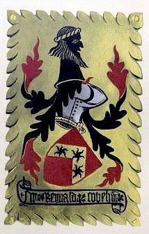 A quadrangular plate of gilt copper with dagged edges. The helm and crest are turned to the sinister