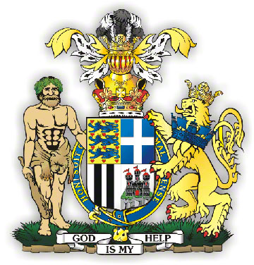 On the dexter side a representation of Hercules girt about the loins with a Lion Skin crowned with a Chaplet of Oak Leaves and holding in the dexter hand a Club proper, and on the sinister side a Lion queue fourchée ducally crowned Or and gorged with a Naval Coronet Azure