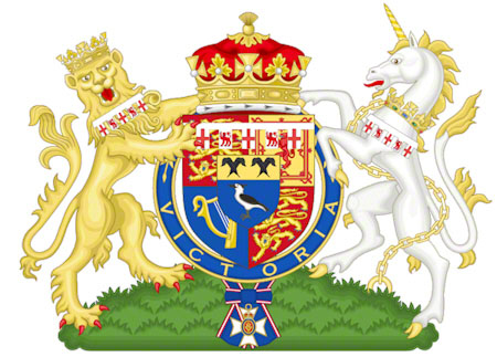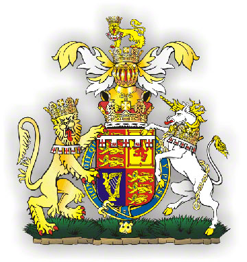 The Royal Arms as borne by HM King George V differenced by a Label of five points Argent charged on the centre and two outer points with a Cross Gules and on the inner points with a Lion passant guardant also Gules