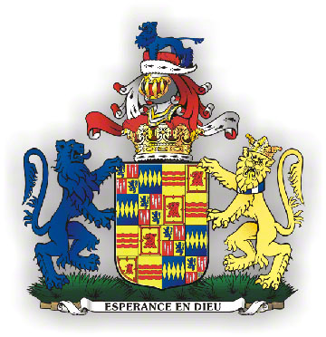 Quarterly: 1st and 4th grandquarters: 1st and 4th counterquartered: 1st and 4th, Or a Lion rampant Azure (Brabant and Lovaine); 2nd and 3rd, Gules three Lucies hauriant Argent (Lucy); 2nd and 3rd, Azure five Fusils conjoined in fess Or (Percy); 2nd and 3rd grandquarters: quarterly: 1st and 4th, Or three Bars wavy Gules (Drummond); 2nd and 3rd, Or a Lion's Head erased within a Double Tressure flory counterflory Gules (Drummond, coat of augmentation)